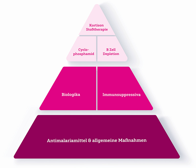 Nachdem es über mehrere Jahrzehnte keine Therapie gab, die speziell zur Behandlung des Lupus entwickelt und zugelassen wurde, werden heute für jede Patientin Antimalariamittel zur Basistherapie eingesetzt. Sie können die Krankheitsaktivität oft deutlich verringern und werden dabei von den Patienten gut vertragen. Je nach Aktivität der Krankheit kommen auch moderne Biologika zum Einsatz. Biologika wirken gezielt auf ein spezifisches Ziel im Immunsystem ein und können so zum Erreichen des Stadiums der Remission beitragen. Zusätzlich gibt es Immunsuppressiva, die auf unspezifische Art die Aktivität der körpereigenen Immunabwehr hemmen. In Phasen stärkerer Krankheitsaktivität kann kurzzeitig Kortison eingesetzt werden. Aufgrund seiner entzündungshemmenden Wirkung wird es bei vielen Erkrankungen als Dauertherapie eingesetzt. Dabei können langfristige Nebenwirkungen wie Organschäden, Nierenversagen, Osteoporose oder Diabetes auftreten. Kortison sollte also im Allgemeinen mit Bedacht angewendet werden. Eine Dauertherapie sollte jedoch nach Möglichkeit vermieden werden, so die Leitlinien-Empfehlungen.